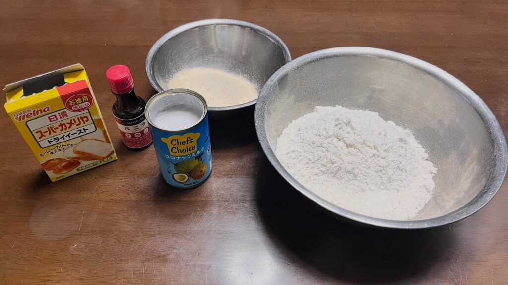 ・小麦粉、砂糖、ココナッツミルク、ドライイーストを混ぜる